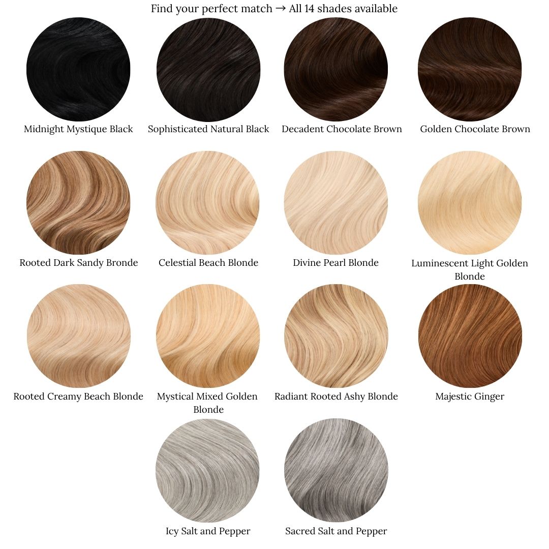 «Heather has curated 14 stunning colors, each a blend of multiple shades for the most natural look, including rooted blondes and Salt & Pepper blends.